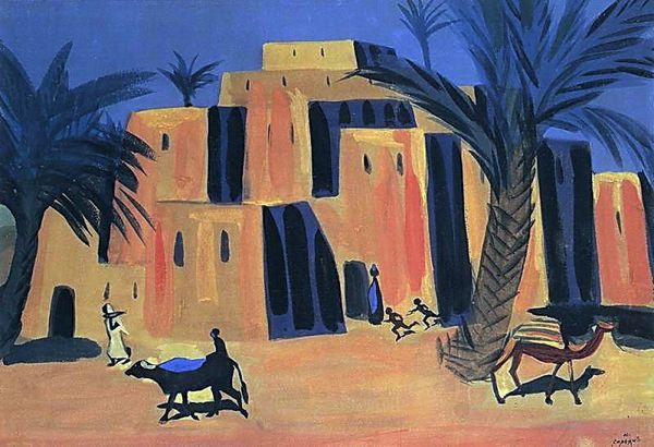 Curator: Martiros Sarian’s “On the Horse,” painted in 1912. Sarian was an Armenian painter, and this work offers a fascinating glimpse into his Orientalist explorations, produced through oil paint. What are your initial thoughts on the painting? Editor: It's raw. I immediately key into the materiality, how thickly that pigment's been laid down. You can almost feel the hand of the artist moving that paint across the canvas. And those earthy tones really connect to a sense of landscape, a specific place. Curator: Precisely! The application, which could be described as expressionistic, brings out vibrant life amidst simplified shapes. Looking at it now, one can analyze its role in constructing images of the Orient, as many artists did in this era, focusing specifically here on equestrian culture. It really evokes an exoticism, while the use of materials anchors the image in a physical reality, what do you think? Editor: The construction is really fascinating, specifically the layering of paint, suggesting an urgency or speed in the artmaking itself. It makes me consider Sarian's relationship to his materials, the sourcing, the grinding of pigments, the specific properties of oil paint and its impact on depicting the light of this landscape, very vivid for an oil. Curator: And yet, while the means are relatively simple, its reception wasn't always so. We have to acknowledge how institutions shape our perspective. In its time, "On the Horse" existed amid a broader art world, an expanding global exchange. Sarian's work found an audience, yet its reception would have been greatly varied due to prevailing perceptions, something which has drastically shifted since. Editor: Exactly, and when looking into these social contexts and art consumption, do we also address that very grounded presence of craft, and folk art traditions feeding into what might be understood as fine art today? I think it calls into question that clear line between making and "high art" that you just touched on. Curator: That’s a wonderful point, one I'll continue to mull over, to consider the impact of societal values when encountering “On the Horse,” and Sarian’s place within cultural currents. Editor: Likewise, I’ll be turning over the nature of the hand in shaping our encounter with a work like this, not just the aesthetic encounter, but an analysis of making practices.