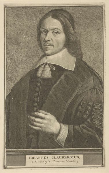 Editor: We're looking at a portrait of Theodorus Johannes Dirk Graswinckel, created sometime between 1636 and 1666 by Theodor Matham. It's an engraving, currently held at the Rijksmuseum. I'm really struck by how detailed the lines are, especially given the medium. What draws your attention in this piece? Curator: What interests me is the mechanics of its production. Engraving relies on a specific division of labour. Think of the artisan meticulously incising lines into a copper plate, creating a matrix to produce identical multiples. This process democratises image production, placing portraits – usually exclusive commodities – within reach of a wider audience. Note also the materiality; ink, paper, and the press itself become central to the meaning. The final print isn't simply a representation, but the product of specific processes and relationships. What do you make of the imagery surrounding the portrait itself? Editor: I see symbolic objects…scales of justice, a rooster…Do those relate to his profession or status? Curator: Precisely. These weren’t arbitrarily chosen, but carefully designed to construct an image of power and authority tied to the sitter's identity. However, considering the socio-economic background of this print, were these images truly impactful, or did their inherent symbolic power get somehow ‘lost in translation’ due to the industrialisation of its making? Editor: That's a fascinating point! It really makes you think about how the meaning changes depending on how accessible the art is and who is making it. Curator: Indeed. Examining art through its materiality and production opens a window into the complex relationships between artist, patron, process, and ultimately, its audience. Editor: This perspective makes me appreciate the work on a different level, by understanding its material process.