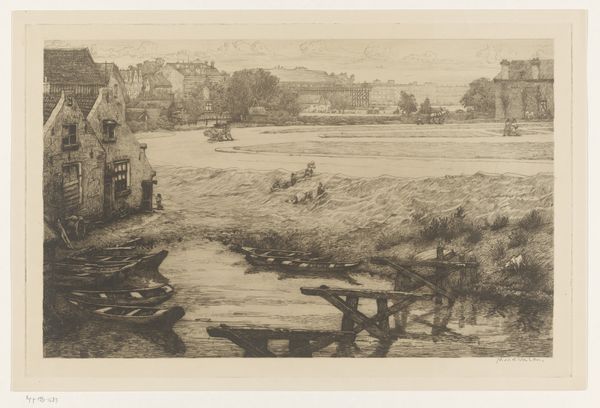 Curator: Here we have Adolphe Appian's "Bridge at Hautville," created around 1870. It's an etching printed on paper, a beautiful example of his plein-air work. Editor: It’s such a moody piece. The stark contrast between light and shadow, the rugged rocks… it feels almost gothic, despite being a landscape. There’s a sense of isolation here. Curator: The contrast is key, yes. Appian was deeply interested in tonalism. Look at the layering of light—how it reflects off the water, hits the bridge. It’s almost dreamlike. The bridge itself could represent a connection to a past age of transport, Roman maybe? Editor: And the figure in the foreground fishing disrupts that past—he’s caught in the present but still bound to natural elements that humans don't control. His presence, though small, makes you think about labor and how even leisure is shaped by access and the physical landscape. Curator: Indeed. Consider the composition, too. The bridge acts as a central anchor, guiding our eyes through the landscape, almost a metaphor for societal continuity. It certainly offers passage but it is in direct contrast to the solid immovability of the land! Editor: Right, the architecture versus nature dichotomy is powerful. The bridge represents human attempt to organize landscape while that dramatic cliff face suggests how powerless those attempts are. What are those little figures standing atop it, gawking and rubber-necking at that grand scenery? Curator: Spectators perhaps, appreciating that which Appian wants to show us; the wonder of place through an accessible romanticist interpretation. Notice too, the etching technique itself. The precision and detail create texture, light and form. Editor: The use of etching also connects it to a long lineage of printmaking, an inherently democratic art form in that it allows for wider dissemination. Landscape art like this, disseminated in prints, would shape perception and foster civic pride. But for whom, one wonders? To what purpose was all this aesthetic contemplation aimed during the upheaval and class divisions of the late 19th Century? Curator: A point well taken! This seemingly serene scene reveals that even idyllic imagery is embedded within complex socioeconomic and historical contexts. The power of place indeed is complexly woven with time, perception and memory! Editor: It's funny how this seemingly simple landscape opens up all of these wider dialogues about our relationship to both the land and each other. Curator: Yes, a landscape alive with meaning still today!