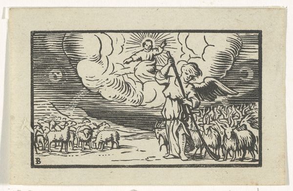 Editor: This woodcut engraving by William Blake, "Thenot Remonstrates With Colinet, from Thornton's 'Pastorals of Virgil'," created in 1821, has such a stark and compelling quality, but its primitive texture gives it a sense of otherworldly immediacy. What historical forces were at play that might explain its look and feel? Curator: Blake’s Virgil woodcuts challenge traditional notions of illustration and accessibility. Commissioned for a schoolbook, they were ultimately deemed too radical for their intended audience, highlighting the tension between artistic vision and market demands in the early 19th century. Do you see how the intense contrast contributes to that radical nature? Editor: Absolutely, the black and white contrast feels almost aggressive. But in what other ways might these small woodcuts reflect broader cultural or political tensions of the time? Curator: Consider the Romantic era's emphasis on individual expression against the backdrop of industrialization. Blake, a vocal critic of societal norms, used these woodcuts to subvert expectations. The pastoral scenes, seemingly idyllic, are imbued with a raw, almost visionary quality, commenting on the perceived corruption of modern life. Think about how he is employing nostalgia here, but simultaneously complicating it. Editor: So, even within seemingly simple illustrations, Blake was embedding commentary on the societal changes happening around him? It's fascinating how a work dismissed as too radical could actually be a powerful cultural statement. Curator: Exactly. It shows the complex interplay between artistic intention, public reception, and the socio-political context in shaping a work’s legacy. Editor: This really demonstrates how considering the cultural moment allows for a much richer understanding of art, even in works initially seen as failures. I will remember that.