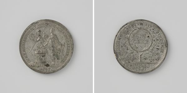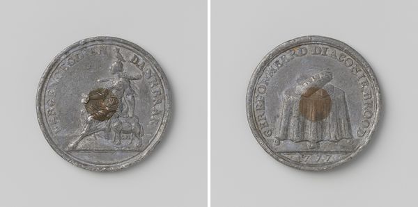 This lead token, made in Amsterdam by Monogrammist CM in the 18th century, presents two sides, each a study in symbolic form and function. The coin's circular shape immediately evokes a sense of wholeness, continuity, and perhaps, the closed circle of a community. On one side, we see a figure distributing bread, an act rendered in relief. The scene seems to suggest an interplay between authority and compassion, indicated by the figure’s elevated position and the offering of nourishment. The reverse shows a coat of arms and inscription which provide a different focus, perhaps reflecting a structural hierarchy of social support. The stark contrast in the materiality, between the lead and the bronze elements, emphasizes a system of signs. The coin itself acts as a medium of exchange, not just for bread, but also for ideas about charity, status, and social responsibility within its cultural context. Through its form and function, this token invites us to consider the complex interplay between material objects, social structures, and philosophical ideals.
