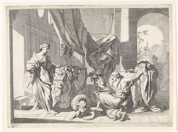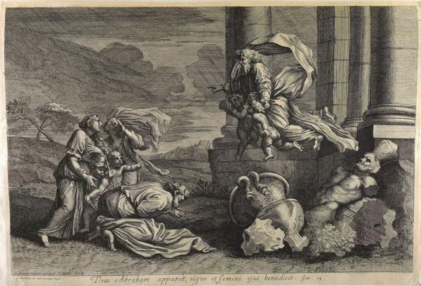 Curator: What strikes me immediately about this piece is the stark contrast—the divine rendered in this almost gritty, earthly way. Editor: You're right. Charles Macé’s “God the Father Appearing to the Madonna and Child” uses engraving techniques to create that effect. Look closely; the layering of lines builds form and tone. Curator: Yes, it's a fascinating interplay of power dynamics, isn't it? God the Father, almost erupting from the sky with accompanying putti, while the Madonna seems more… grounded, literally kneeling. It reminds me of the enduring motif of the Annunciation, seen across centuries of art. Editor: And the material tells its own story. Prints like this made art more accessible, circulating religious imagery within a broader social context. Who was buying these? Where were they displayed? The consumption is key. Curator: Indeed, that accessibility allowed these images to become deeply embedded in the cultural memory. This piece clearly draws on a rich visual tradition, but Macé infuses it with a distinct emotional intensity. Editor: Thinking about labor… each line carefully etched, reproduced. It speaks to dedication, to making faith tangible. Curator: It is intriguing how the material process and symbolic weight converge. Editor: Exactly, there’s a beautiful tension to unpack.
