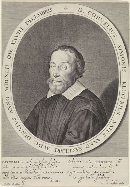 This is Crispijn van de Passe the Younger's engraving of Gijsbrecht ab Isendoorn, made circa 1642. Immediately, the meticulous detail of the engraving stands out. Lines upon lines create a sense of texture and form, particularly in the rendering of Isendoorn’s face and clothing. The oval portrait is framed by inscriptions, integrating text as a compositional element. Consider the semiotic interplay here: the image of Isendoorn, a professor, surrounded by text that elucidates his identity and virtues. The engraving functions as a signifier of status, knowledge, and perhaps even morality. The formal structure, with its precise lines and balanced composition, mirrors the structured intellectual world Isendoorn inhabited. The choice of engraving as a medium is crucial. It allows for reproducibility and dissemination, fitting for a public figure like a professor. The artwork thus becomes part of a larger cultural discourse, reflecting and reinforcing societal values around education and representation.
