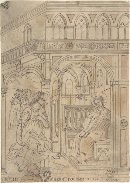 Editor: This is "Domi Manere" by Antoon Derkinderen, probably created between 1869 and 1925, a drawing using watercolor and ink on paper. I'm really drawn to the muted tones and how it evokes the imagery of medieval manuscripts. What's your interpretation of this piece? Curator: Considering Derkinderen's background, this piece feels particularly concerned with the act of production and its historical context. The choice of watercolor and ink, reminiscent of medieval illuminated manuscripts, isn't arbitrary. It speaks to a deliberate engagement with the labor-intensive processes of the past. Editor: I see that. The faux-medieval style seems very deliberate. Curator: Exactly. We should also consider the materials themselves – the paper, the pigments – and how their availability and perceived value changed over time. It asks, what labor went into creating the very object we see here? How does this drawing reproduce earlier craft techniques? Editor: It's fascinating to think about the social implications, not just the aesthetic qualities. It seems almost a critique of mass production through its handmade appearance. Curator: Precisely. The deliberate revival of historical techniques serves to highlight the inherent value and skill diminished by industrial modes of production. Editor: I never considered the actual making of the piece that deeply. That the materials and production choices could make an argument by themselves. Curator: Paying attention to the materials reveals so much more about the artwork's intentions and embedded cultural values. I’m glad to see a younger audience think through making and production this way.