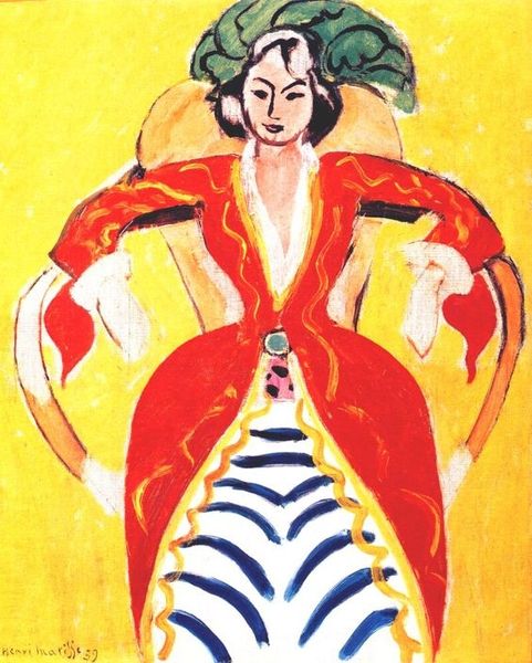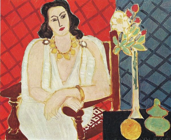 Curator: Here we have Henri Matisse’s “Helen with a Precious Stone,” an oil on canvas completed in 1937. What strikes you about it? Editor: Immediately, it’s the intensity of the color that grabs me—the almost clashing reds, greens, and yellows shouldn’t work, yet they vibrate with life. The simplified forms and flattened perspective create a powerfully decorative effect. Curator: Indeed. Knowing the period—the late 1930s, with fascism rising across Europe—it's easy to view such an interior scene, with its privileged female subject adorned with finery, through a critical lens. What statement, if any, is Matisse making by portraying this domestic, decorative scene as political tensions flared across Europe? Editor: That's a compelling point, though perhaps he was finding solace, an escape into pure form and color, as a way to navigate that tumultuous historical moment? Look at how the patterns—the stripes on her dress, the decorative collar, the floral motif on the blouse, the background foliage—are treated as equally important as the figure, dissolving any traditional hierarchy of subject and ground. Curator: I appreciate your emphasis on its formal aspects, and I see his dedication to a language of painting over realism, but can we ignore the politics implicit in retreating to such insular themes at that historical juncture? Women were experiencing a different form of freedom at this time, becoming central to social and work movement--why this image of bourgeois class? Her jeweled accessory may symbolize how economic freedom has its restraints when viewed through a modern intersectional lens. Editor: The figure itself is a study in simplified volumes; a distillation of form rather than a detailed portrayal. It could speak to his formalist exploration beyond cultural considerations and more directly at issues of rendering shape and color, like his use of arabesques. Look how they repeat in the dress, in the line of her arm, the way they echo throughout the plants in the background; each one playing with shape. Curator: Perhaps there isn’t one right way to interpret it; as an exploration in style, an exercise in portraying identity through interior portraiture, or as an unintentional encapsulation of a conflicted time. Editor: In any case, the tension it creates, between representation and abstraction, chaos and control, is certainly its enduring power.