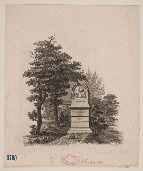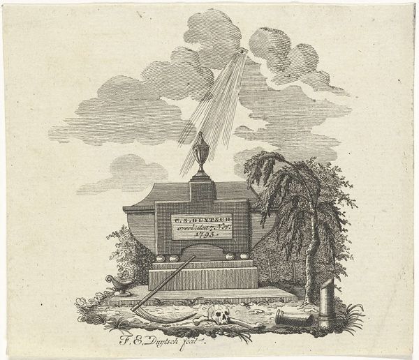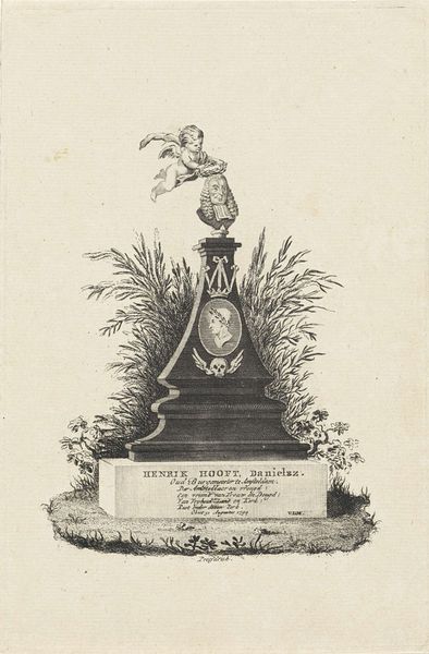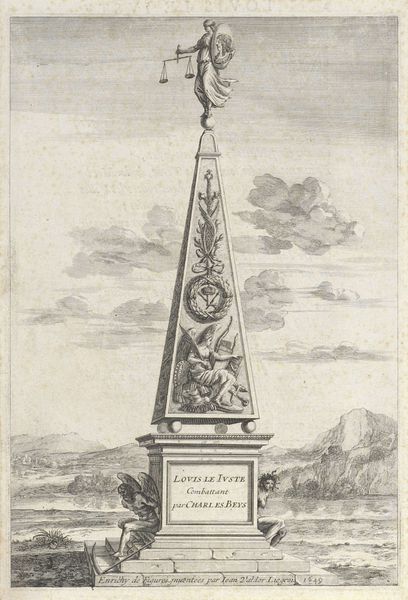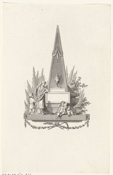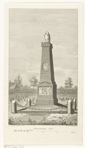 Joannes Bemme made this print of the Gedenknaald voor de Vrede van Rijswijk 1697 with etching. The print commemorates the Peace of Rijswijk, a treaty signed in 1697, which ended the Nine Years' War between France and the Grand Alliance. Bemme created this print during a period of significant political and social change in Europe. The rise of nationalism and the shifting alliances among European powers shaped the cultural landscape. The monument itself, and consequently this print, serves as a symbol of negotiated peace in a world often defined by conflict. Consider the monument’s implicit commentary on the human desire for peace amidst constant war and the role of diplomacy in achieving it. The print’s existence speaks to the desire to memorialize pivotal moments in history and their impact on collective identity. The monument and this print embody the hope for lasting peace and the acknowledgement of the human cost of war. This artwork prompts reflection on the cyclical nature of conflict and peace.