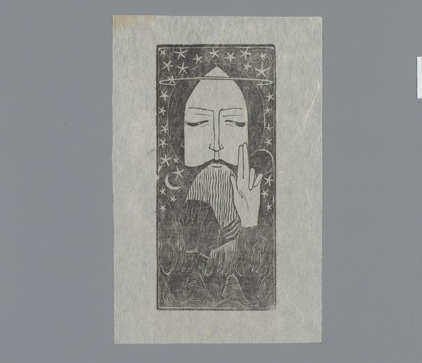 Curator: What an evocative piece. Here we have Max Weber's "Seated Woman," a woodcut likely created between 1919 and 1920. The red figure against the mottled gray ground—what's your immediate reaction? Editor: I'm struck by its density. Red against grey gives it an intensity, and the roughness of the woodcut is also important. You can sense the labor, and it moves far from notions of high art. It also feels ancient in a strange way. Curator: Indeed. Weber was deeply engaged with Primitivism, that search for the foundational symbols of human experience. The woman's large, downward-cast eyes, that simple necklace, evoke something ancient and universal in the feminine. She feels both powerful and vulnerable. Editor: But I also wonder about the politics of it all. Given the period, that postwar moment of uncertainty, was the artist grappling with modern anxiety and new perspectives through these "primitive" forms, using available means of production? What does this tell us about access and creative means in the early twentieth century? Curator: Good question! The simplified forms speak to the trauma and searching of the Expressionist movement. And perhaps to the deeper, more profound questions about existence. Notice the pattern at the bottom: is it decorative or structural, suggesting perhaps the supports of a stage, a life lived consciously as representation? Editor: I think we could agree that in its reliance on easily attainable and manually operated methods such as woodcutting, this expressionist piece offers a raw and accessible glimpse into the intersection of artistic intent, material reality, and societal expression in a pivotal epoch of art. Curator: I agree completely; the image and materials work hand in hand, both reflecting the complex state of art. Editor: Agreed.