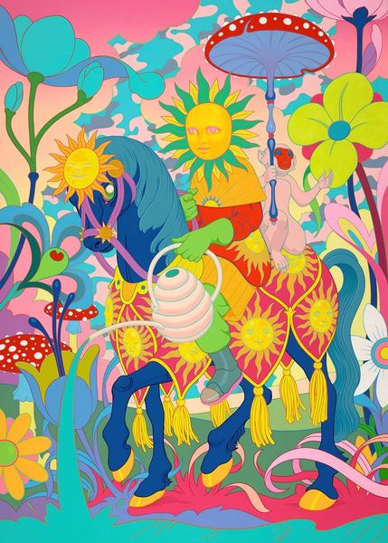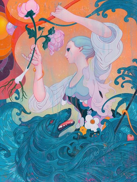 James Jean made this painting, "Goat IV," sometime in the 21st century, and looking at it, I see an embrace of process as much as image-making. The way colors bleed into each other and lines suggest forms that aren't quite there reminds me that art is as much about the journey as the destination. The colors here feel like a dream—reds that pop, yellows that soothe, and blues that ground the whole thing. The texture seems smooth, almost like it's been glazed over, which gives it this surreal, ethereal quality. Look closer, and you'll find these tiny details, little marks, and dots that seem to vibrate on the surface. It's these small, almost hidden gestures that give the work its life. Jean’s work makes me think of Yoshitaka Amano, who also blends the figurative and the fantastic. Ultimately, art is about embracing ambiguity and multiple meanings, right?
