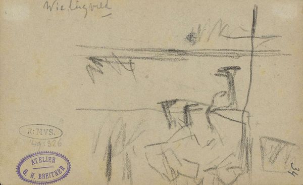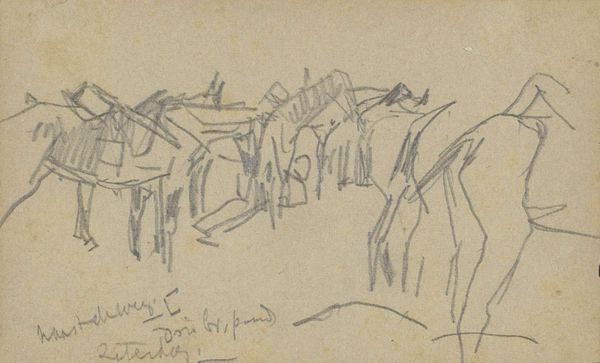This pencil sketch, made by George Hendrik Breitner, now resides in the Rijksmuseum. It is a study of a landscape with a horse and two soldiers. The use of pencil on paper is about as direct as you can get; the artist's hand is immediately evident. We can see how Breitner worked rapidly, capturing the essence of the scene with a bare minimum of strokes. The thinness of the lines and the slight pressure applied create a sense of immediacy, like a fleeting impression caught on paper. The artist has quickly laid down a scene that's more about atmosphere than detail. This approach reflects the social context of the time, with artists turning away from academic polish towards more spontaneous and personal forms of expression. It’s a world away from the highly finished military paintings of previous generations; instead, we get a glimpse of modern life, rendered with a light touch. Looking closely at the materials and the artist's hand, we gain a deeper appreciation for the work.