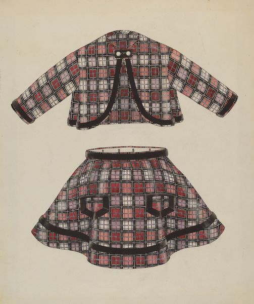 Editor: Here we have Richard Taylor's "Child's Waist," a watercolor and drawing from around 1938. I'm really drawn to the meticulous rendering of the fabric pattern. It seems almost photographic, yet softened by the watercolour medium. How do you see the success of the image through composition, line and materiality? Curator: The appeal lies precisely in Taylor's acute attention to detail and his manipulation of form through tonal variations. Consider the artist’s precision in replicating the floral motif, repeated almost obsessively, forming a delicate, though complex tapestry of colour. The modulated light lends it volume and shape. Do you notice how the slight tonal shifts within the ground evoke a sense of subtle movement and dimensionality? Editor: Yes, it does! It prevents the whole thing from becoming too flat and static. Curator: Precisely. This interplay between detail and the medium of watercolour defines the visual experience. By embracing a flat pictorial space whilst retaining detail, Taylor achieves a tension within the decorative scheme. Note the simple repetition of flower motifs, organized in an implied geometric grid. How might such structure affect our engagement with the artwork? Editor: Perhaps it provides a framework for the eye, encouraging us to notice subtle differences and patterns that might otherwise be overlooked. The simple framework encourages observation of the small details that matter. Curator: Exactly. Furthermore, the drawing provides not just a faithful rendition of fabric. Look how the use of shadow implies weight to the shoulders of the form. Through delicate manipulation of material properties – here paint – we come to a closer consideration of representation in decorative art. Editor: That's given me a fresh way of looking at seemingly simple decorative art! Thank you. Curator: You’re most welcome. This process of close inspection always illuminates the formal means and visual effect intended by the artist, if only we attune ourselves to observe attentively.