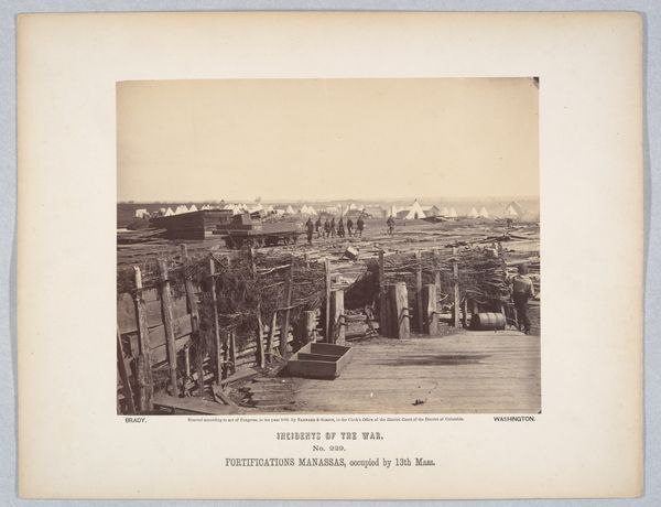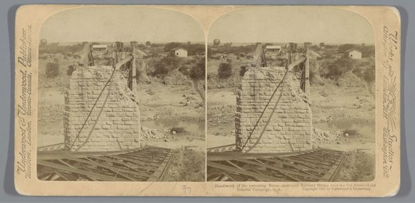 Curator: This rather faded gelatin silver print from 1900 depicts "Gezicht op een brug over de Modderrivier, Zuid-Afrika"—a view of a bridge over the Modder River in South Africa. Editor: The photographic greys create an eerie atmosphere. The structural geometry of the bridge against the soft landscape is striking. The heavy, earthy tones feel weighed down, somehow. Curator: Interesting. As a landscape, it conforms to certain compositional expectations of realism—note the clear horizon line. But the bridge itself is more than just an object within the scene; it acts as a symbolic device. Editor: A device for what? It seems like more than an aesthetic structure, as its obviously connected to a specific social and economic purpose. Who built this bridge and what impact did its creation have on this landscape? It stands apart from the natural world surrounding it. Curator: Yes, quite! It implies industry, progress, even dominion over nature. See how the stark diagonals of the ironwork bisect the softness of the natural terrain. It's a powerful contrast, suggesting imposed order. Editor: It reminds me that even seemingly objective documentation is never neutral. Photography during this period in South Africa would’ve inevitably reflected the context of colonial expansion and resource exploitation, the social and economic conditions framing that enterprise. We can tell, it probably represents engineering in the service of an Empire! Curator: The receding perspective is particularly strong, drawing the eye through the composition and emphasizing the bridge's extension over distance. Editor: Exactly, physically connecting, yet potentially disrupting a sense of place. It offers a particular reading of a nation. This print then isn’t just a record but evidence of ideological currents at play. Curator: Well, considering both its form and context definitely brings richness to viewing the work. Editor: Absolutely. It deepens our understanding of the politics embedded in an artwork such as this, so that it becomes far more than simply representational.