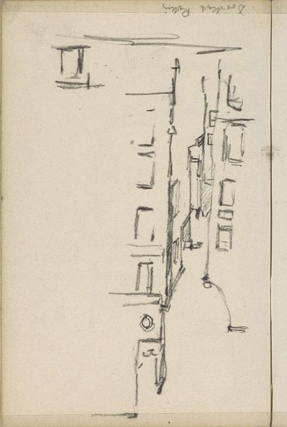Editor: This is "Gezicht in Amsterdam," a pencil drawing on paper made around 1902 by George Hendrik Breitner. It feels like a fleeting sketch, a raw glimpse of the city. What catches my eye is how architectural elements blend into seemingly random lines. How do you interpret this work? Curator: It speaks volumes, doesn't it? This isn't just a cityscape; it's a visual record of a psychological experience. Consider how Breitner, steeped in Impressionism, captures the fleeting essence of Amsterdam. The rough lines, the unfinished quality – they aren't imperfections, but potent symbols. What kind of collective memory do you think this drawing tries to preserve or construct? Editor: I see it as capturing a moment in time, almost like a photograph but more subjective. Maybe it’s preserving the feeling of a quickly changing urban landscape? Curator: Precisely! And those seemingly "random" lines you noticed? They represent the layers of history, the constant state of flux inherent in a city. Think about Amsterdam’s history of trade, immigration, and resilience. Could these lines symbolize that constant negotiation between the past and present? Editor: That's fascinating. I hadn’t thought about the lines representing historical layers. I was so focused on it being a quick sketch. Curator: Exactly! See how a "simple" sketch can unveil layers of cultural meaning? It reveals that symbols are not static, they're dynamic and responsive to context. Breitner encourages us to decipher Amsterdam’s ongoing story, not just its visible façade. What will you remember from this piece? Editor: I'll remember that art, even in its most unfinished state, holds complex layers of meaning tied to collective memory. It's a city's story told through suggestive lines.