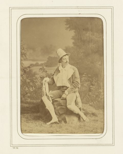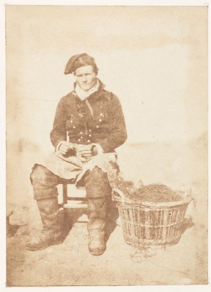 Curator: Today, we’re looking at “Newhaven Fishermen,” a gelatin-silver print by Hill and Adamson, made between 1843 and 1847. Editor: It’s quite striking, isn't it? The texture in the photograph itself lends a kind of raw realism to the figures. A real sense of the weight of their lives. Curator: Absolutely. The tonal range here is subtle but precise. Look at how the light defines the forms, creating a delicate balance between shadow and illumination across their faces and clothing. It's masterful use of the early photographic medium, capturing depth with limited resources. Editor: I’m drawn to their weathered faces, their posture, their clothing - rugged but neat. They're archetypes, in a sense, embodiments of the stoic fisherman, facing harsh elements. Notice the man with the pipe – a signifier of labor and masculine identity? Curator: An excellent observation. Considering the photographic technology of the time, posing and composition became key. The positioning of the subjects within the frame, their subtle variations in gaze, establishes a compelling structural relationship, suggesting a bond of solidarity or camaraderie. Editor: And perhaps vulnerability? Their proximity speaks volumes, given that these are working-class men, not typically represented in formal portraiture at the time. They stand as a representation, becoming symbols of a specific cultural group. The basket also. A potent representation of a tool they might use. Curator: Agreed. The arrangement, while seemingly casual, is meticulously calculated. This use of realism marks a decisive move away from idealized representation towards a more genuine depiction of labor and class. The formal structure conveys their shared history. Editor: Knowing that these fishermen may not have had a voice within societal representation adds complexity. This portrait then transcends simple image making and rises to a profound reflection of community identity. A historical marker of labor, resilience, and unity captured within the emulsion of a photograph. Curator: Precisely. We can appreciate not only its aesthetic merits, but its groundbreaking contribution to representing society outside of aristocracy within art history. Editor: A very compelling study through light and image.