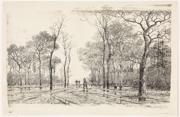 Editor: Breitner's "Groep ruiters, zich verzamelend op breed bospad," which roughly translates to "Group of riders gathering on a wide forest path," dated somewhere between 1867 and 1923, is an intriguing pencil drawing. The heavy lines suggesting a rutted path immediately grab my attention. What material considerations stand out to you in this piece? Curator: Well, consider the rough pencil strokes. They weren't just representing trees and riders; they were performing labor. The very act of repeatedly scoring the paper with graphite builds texture. Think about the availability of mass-produced paper and pencils during this period – a product of industrialization enabling the creation of such scenes. Editor: So, it's not just about the scene itself, but also about how accessible the *materials* were, which made this kind of everyday subject matter possible? Curator: Precisely. Breitner wasn't painting grand historical narratives. He was capturing a slice of daily life made possible, in part, by the tools at hand. The looseness of the etching suggests speed, capturing a fleeting moment with the materials readily available. Who would these riders have been and how does it affect what is being produced and represented in this drawing? Editor: It does suggest a very immediate, almost journalistic approach. Considering it's in the Rijksmuseum now, its existence also hints at the art market emerging that would consider this as art in the first place. It gives an insight in to what everyday scenes are of material interest. I never thought of it that way before. Curator: Indeed, and it prompts us to question what we value and what makes art in a material sense. Editor: I’ll definitely look at sketches differently now! It makes you think how art reflects not only what we see, but the circumstances around how it was produced and for whom.