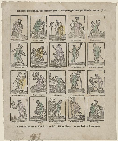I.I. de Lanier's Figuren presents a tableau of 16 distinct vignettes, each encased in a rectangular frame, rendered with delicate strokes in ink and watercolor on paper. The composition, a grid-like arrangement, initially appears orderly, yet the individuality of each scene disrupts any sense of uniformity. Each miniature world teems with figures engaged in various activities, from the pastoral to the quotidian. The limited palette of muted blues, browns, and creams enhances the quaintness of these scenes, while also underscoring a subdued emotional tone. The charm of Figuren lies in its structural simplicity. The piece resonates with a subtle commentary on the human condition, mirroring the range of experiences and societal roles. It invites us to reflect on the diverse threads that constitute the fabric of our shared existence. Through this structured composition, de Lanier prompts a deeper engagement with the nuances of everyday life.
