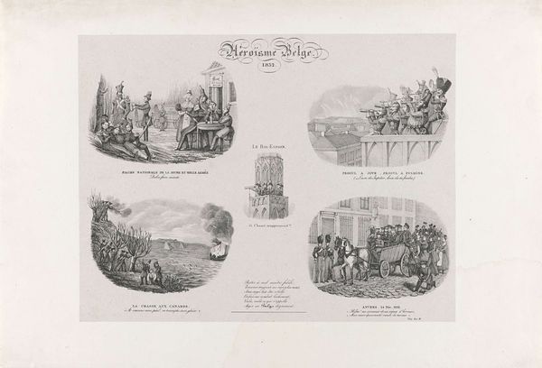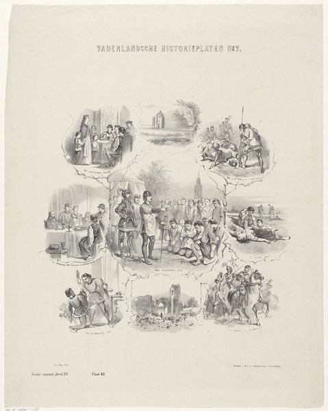 Curator: Here we have "Batavieren en Romeinen in Nederland" a historical print dating from before 1896 and attributed to Gerardus Johannes Bos. What strikes you first about this engraving? Editor: The layout, definitely. It looks like a storyboard, with these vignettes scattered across a map. Almost like episodes from a saga. I am struck by the mood, it feels serious but playful. Curator: Indeed! The print uses imagery and symbols from a foundational national narrative. The map, outlining the Netherlands, situates the Batavian revolt – a pivotal uprising against Roman rule. It suggests a geographical anchor to a specific sense of Dutch identity being constructed. Editor: The symbols are powerful. The repeated imagery of leaders, weapons, battles... each mini-scene seems like a concentrated dose of nationalistic visual messaging, tapping into deep-seated ideas about heroism and resistance, reminiscent of folklore archetypes. Curator: Exactly. How might these depictions reflect or challenge established power structures of the time? I would bet that the Batavian narrative of fighting for freedom from an imperial oppressor became something of a rallying cry, but for which socio-political causes? Who does it implicitly include, and perhaps more importantly, exclude? Editor: Interesting point! Thinking about visual memory, the Roman figures too have certain persistent qualities to them. Even in defeat they radiate the cultural power of that once dominating empire. I see a parallel in the image of the leaders of those peoples and tribes who populate those tales to those that populate these images, which still feels familiar even after so long. It hints at a deeply woven historical mythology. Curator: Yes, this engraving embodies the selective and often ideologically charged construction of a historical narrative. Editor: It's amazing how much historical weight can be compressed into seemingly simple illustrations, full of images that trigger emotions of pride, nostalgia, even resentment. I almost think about the idea of shared collective past, it provides those emotions with some symbols we keep returning to again and again through ages. Curator: Precisely. The relationship between this piece and modern iterations of national and regional pride can reveal powerful insights. Editor: A valuable example then of the complex interplay between images and ideologies and the memory we retain of them.