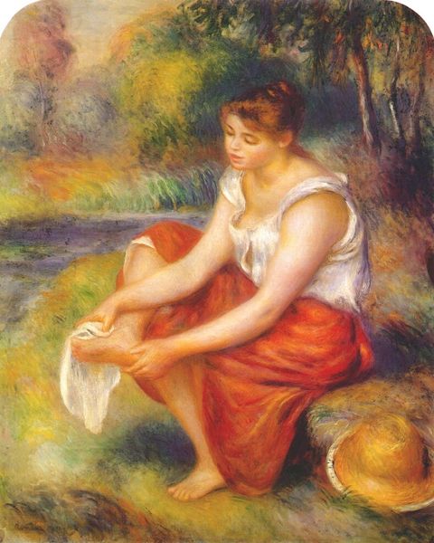 Here we see Renoir's 'Girl with a Straw Hat'. The straw hat, an object of both utility and adornment, immediately calls to mind the pastoral, the rural, and the elemental. This head covering has been a recurrent motif in art through the ages, symbolizing the working class. Interestingly, in classical antiquity, head coverings, especially straw hats, were associated with agricultural deities, embodying fertility and abundance. We see echoes of this in later Renaissance art, where figures in similar garb evoke an Arcadian ideal, a longing for a simpler, more natural existence. The modern girl, with her loose auburn hair and pensive gaze, evokes a sense of fleeting beauty, a reminder of mortality. The straw hat, therefore, becomes a potent symbol, weaving together themes of nature, labor, and the transience of human existence. It engages us on a deep, subconscious level. The hat and the woman's red hair become archetypes, resonating through our collective memory.