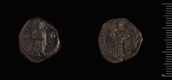 Curator: There's something so evocative about ancient coins, isn't there? This one, an Antoninianus of Tacitus, feels like a tangible link to the past. Editor: It's got a melancholic feel to it. The wear and tear speaks volumes. Curator: Absolutely. Think of all the hands it's passed through! The imagery seems rather standard imperial iconography, but the material decay is intriguing. It invites a conversation about the passage of time and the impermanence of power. Look closely at the surface—the corrosion almost obscures the ruler's face. This hints to me at an erosion of ideals as well. Editor: Or perhaps a commentary on access. Who could hold it? Whose hands were denied its value? Curator: Good point! What do you make of the figures on the reverse? Editor: They seem to represent deities, underscoring the intertwining of imperial power and divine authority, a concept used to legitimize rulers and suppress dissent. It's a tool, really. It says "obey your ruler because he's divinely appointed." Curator: I agree! It's interesting to contemplate the political implications embedded even in such a small, seemingly simple object. Editor: Absolutely. Even this little thing held so much social meaning. Curator: Makes you think, doesn’t it?