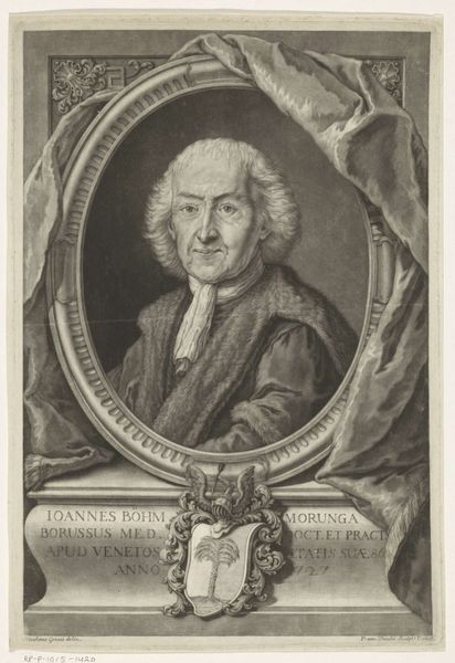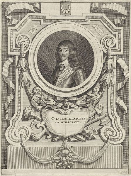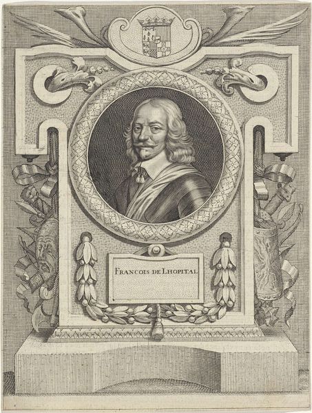 Curator: Looking at this, the somber yet dignified presence conveyed by Antoine d'Aumont de Rochbaron jumps out immediately. There's a calculated gravity that the artist has etched onto his features. Editor: Precisely! This print, created in 1649 by Johannes (II) Valdor, captures d'Aumont within the established visual rhetoric of power, a reflection of his station. Note how Valdor has encased him in a rather ornate, decorative setting. It tells us much about portraiture and status in the baroque period. Curator: That ornate framework certainly makes a statement. I can’t help but notice the almost surreal, and frankly, somewhat sexualized female figures flanking the portrait. They speak volumes about the era’s complex understanding—and exploitation—of the female form, even in seemingly unrelated contexts such as a nobleman's portrait. It almost feels like a hyper-masculine response. Editor: It’s certainly busy! But that level of ornamentation, those symbolic flourishes, weren't accidental. The framing reinforces social hierarchies. D'Aumont's own military achievements and aristocratic lineage would be central to how viewers at the time would have understood this work. Those figures function as allegorical references – potentially Fame and Abundance given the cornucopias! Curator: Right, you are leading me towards viewing them as emblems within the elaborate tapestry of power Valdor is weaving here. They subtly yet powerfully remind us of the socio-economic landscape. In a portrait intended to secure a legacy, everything, even ornament, is ultimately a statement. The work becomes not merely about capturing likeness but actively constructing an image, which certainly reflects contemporary power structures in regards to wealth, legacy and position. Editor: Indeed. Ultimately, viewing the work through this socio-historical lens enables us to engage critically not only with the image itself, but also with the structures and attitudes it perpetuates. The portrait becomes more than an object; it becomes a conduit through which the past speaks, sometimes unsettlingly, to our present. Curator: I appreciate your detailing of the context behind portraiture's power, bringing attention to those historical elements which help us view d’Aumont’s image with greater historical perspective. It does invite us to recognize just how much art and legacy, even print-making such as this engraving, can impact perception. Editor: It has been insightful to analyze the historical significance within its era of creation; aspects that certainly enrich any museum visit!