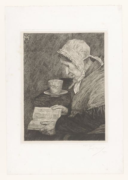 This etching by Joseph Dujardin presents an intimate scene of an old woman engrossed in a book, a teacup resting on the table beside her. Note the book, a vessel of knowledge and memory, echoing the ancient symbol of the scroll. From the Library of Alexandria to medieval illuminated manuscripts, books have represented wisdom passed down through generations. Here, the woman's bowed head and the book's prominence evoke contemplation and introspection, drawing parallels to depictions of saints or scholars in earlier art. Consider the teacup—an object of domesticity, yet also a symbol of ritual and comfort. This simple scene subtly engages our collective memory, drawing us into the woman's private world. The very act of reading, of seeking knowledge, connects her to a lineage of thinkers and dreamers throughout history, proving that symbols are never still, they are carried through time, evolving, resurfacing, and inviting us to find resonance between past and present.