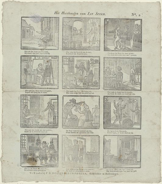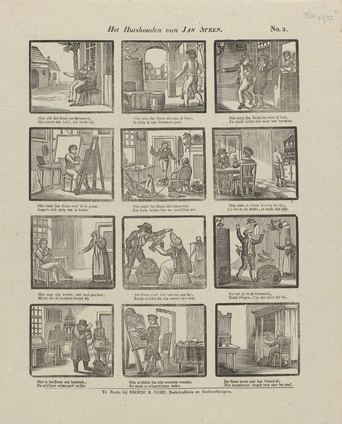 This print, "The Origin, Progress, and End of Human Life," was made by Alexander Cranendoncq in the 19th century. The artist presents the cycle of life through a series of small, framed scenes arranged in a grid, from infancy to death. Notice how the linear structure provides a sequential narrative, but also implies a cyclical understanding of human existence. Each scene, though small, contains carefully rendered details that invite close inspection. Consider how Cranendoncq uses light and shadow to create depth within these miniature worlds. The graphic quality of the printmaking medium reduces the world to stark, tonal contrasts. This heightens the moral undertones of the print. The human experience is conveyed as a series of stages, each carefully observed and framed within the broader structure of existence. The print invites reflection on the human condition. The use of clearly defined lines emphasizes the boundaries of each stage, reinforcing a sense of order. But the overall composition implies a fluidity to the life cycle, and the individual scenes are interconnected within the frame.