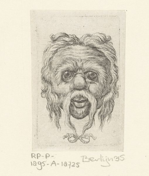 François Chauveau created this miniature print, Masker met snor, using engraving techniques. The intricate lines that define the grotesque mask are etched into a metal plate, likely copper, with careful strokes of a burin. Consider the labor invested in such a detailed work, where each line contributes to the overall texture and form. The process demanded precision and control, reflecting the engraver’s skill. The mask’s exaggerated features, from the drooping mustache to the menacing eyes, come alive through the careful manipulation of light and shadow. The material qualities of the print—its small scale and the fineness of its lines—invite close inspection. The work's status as a print also means that it was made for distribution, a democratization of imagery that parallels the rise of the market for luxury goods. Looking at this print, we recognize the deep integration of material, process, and social context, challenging any divide between craft and fine art.
