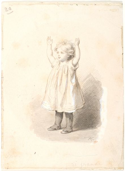 Curator: Looking at Elizabeth Murray's watercolor, graphite and ink drawing from 1848 entitled, "Child Praying" feels incredibly intimate. I’m immediately struck by the girl's upward gaze and the simple composition, placing the figure in an ambiguous landscape beneath a pale sky. Editor: My first thought is how Romantic and sentimental it seems, with a hint of genre painting through its approach to figure and landscape. It invites quiet contemplation. The girl's posture creates a visual plea—her clasped hands, the bowed head... It's masterfully constructed for evoking pathos. Curator: Considering this piece within its historical context, the mid-19th century in England saw vast social changes. Religious sentimentality became quite common, especially within domestic portraiture like this. What kind of person do you imagine would own this image, and what would it signify? Editor: Well, if we consider the application of watercolor on paper and how portable these items can be, such drawings offered sentimental and pictorial value for the family as personal tokens rather than some kind of devotional subject. I note also how the wash of colors evokes a very dreamlike—or ethereal state of emotion—but that her feet being bare root her in a more visceral realm. Curator: It's fascinating how you focus on her feet to understand her earthly condition. For me, that positioning—of a barefoot girl seemingly outside, exposed to the elements, yet in prayer—speaks to both the vulnerability and resilience often attributed to childhood, especially during a period of increased industrialization where child labor was rampant. Murray's composition is poignant. Editor: True. However, do you see the way her dress falls? Observe the highlights there and the very slight application of dark shadows giving three-dimensionality to a very flat surface... In doing so, she still manages to depict her garments without losing their essence as a form on paper—one could also see a direct relationship between color and emotional response at the core of her piece. Curator: And within this framework, can you feel that Murray aimed to provide this image not as just an intimate family memento, but rather as an aspirational, idealized form of innocence in times of great societal shifts? This connects her work to larger narratives around childhood, morality, and representation during her time. Editor: Certainly, she sought to evoke the emotions. The drawing succeeds as it still invites a rather close visual contemplation through its masterful employment of simple washes on a smooth surface—and it offers me peace knowing it still resides here at the Art Institute of Chicago today. Curator: Agreed. Examining its historical conditions provides us insight into societal narratives, yet its composition and materials— watercolors, paper, ink—remain effective carriers of her emotive expressions towards an image that continues to move its viewers in multiple ways.