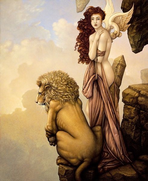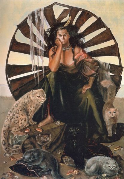 Curator: This is "Woman with Walrus," a painting attributed to Ken Kelly. It’s an acrylic painting with bold figurations, an image which straddles neo-expressionism and fantasy art. Editor: Oh, she’s something, isn’t she? It feels like an old dream, doesn’t it? The kind where everything is just slightly too intense, the colours, the gaze, and of course, the walruses. I like that, like something I cannot put my finger on from an epic I half remember. Curator: Well, Kelly’s career certainly touched on the epic. He’s primarily known for his contributions to fantasy art, creating imagery that directly catered to album art for bands and the illustration of heroic characters. One could say he’s providing a market demand. Editor: He’s leaning into that market for sure. Look at how the walruses are rendered almost as these regal beasts, protecting and elevating this woman. It feels… primeval almost, some echo from a long-forgotten myth cycle. The theatrical presentation! That's it! Curator: Consider also how the acrylic paint is applied. He layers washes of colour, particularly in the background, which is then juxtaposed against heavier application. Look closer, you will find it in the definition around her form. It allows the subject to be separated from its atmosphere. Editor: And what an atmosphere. Pale lilac and pink, very dreamy and diffuse. Her form, that angular almost intimidating presence walking forth accompanied by these powerful but docile… giants? It all comes across to me like that kind of hyper-real state just before you fully awaken, so tangible it bleeds. Curator: Indeed. It represents a key approach in genre-defining art that focuses on highly romanticised yet carefully constructed figures in fantastic narratives. So one must remember that there is an important commercial aspect to understand the piece. It could be cover art! Editor: Knowing that doesn’t detract from the impression. What stays with me, in spite of his material conditions that drive such images, is the way he gives a face to some deeper, less-defined part of our shared consciousness. I could see myself getting lost within that world. Curator: Agreed, a worthy approach! He successfully marries commercialism with what you so rightly pointed out, art’s ability to capture and give expression to feelings and our very nature.