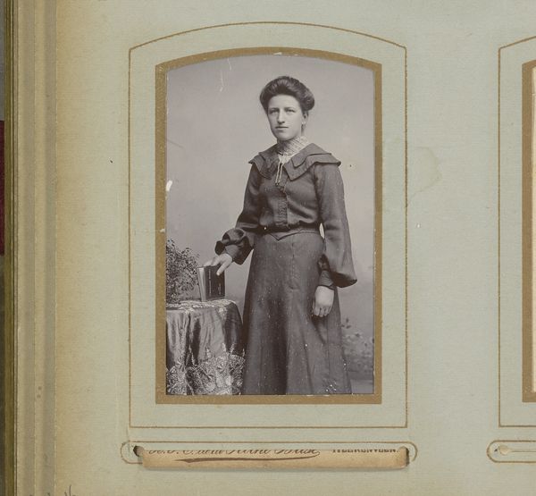 Curator: Here we have a photograph entitled "Portret van een zittende vrouw met witte muts," or "Portrait of a Seated Woman with White Cap." It’s dated somewhere between 1885 and 1915 and believed to be by Gerrit Leenheer. Editor: Wow, there's something so hauntingly still about her. The sepia tones amplify a feeling of gentle solemnity. Is it the stiff posture or her serene expression? Curator: Perhaps both? Portraiture in the late 19th century often adhered to certain conventions. This was photography’s "impressionist" era; the staged background, the formal pose – they echo painting traditions. But the photograph itself is something quite new. Note her cap and dress. In the right context these would telegraph social standing. Editor: I find her simultaneously unknowable and deeply familiar, which is peculiar. Those are obviously posed elements of 19th-century photography... And yet she feels like someone I know. Or knew. Maybe she haunts my family albums! Curator: (chuckles) I appreciate your perception. She could be anyone’s ancestor. The white cap, or "muts", traditionally indicated regional or religious affiliations. Though by the turn of the century, it also stood for progress and reform, especially as women started seeking a place outside domestic roles. Editor: So, the "muts" might not simply represent modesty; it's a sign of an unfolding role for women at the end of the nineteenth century! How exciting that fashion can be so evocative and informative! Curator: Precisely. The photograph preserves a pivotal moment, revealing shifting ideas on women's identities. And how she looked mattered. Editor: Absolutely. Now I see less of a ghost in my family album, more of a real person on the verge. That’s lovely. Thanks!