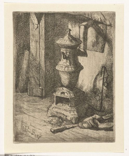 Rodolphe Bresdin created this intricate etching titled, "Interior, Peasant House in Haute-Garonne." The density of lines and the stark contrast between light and shadow immediately strike the eye, creating an almost claustrophobic sense of enclosure. The composition, built upon layers of objects and figures, is far from naturalistic, defying conventional perspective. The dwelling is filled with an abundance of forms that compete for space, blurring the distinction between foreground and background. The family huddle near a fireplace, surrounded by meticulously rendered objects – pots, pans, and other domestic items. Bresdin's technique challenges the prevailing artistic values of his time, reflecting a fascination with detail and a willingness to disrupt traditional notions of harmony and proportion. This print is not simply a depiction of rural life; rather, it serves as a symbolic space where the boundaries of representation are tested. The work invites us to question how meaning is constructed through visual density, and how the artist uses form to challenge our understanding of space and representation.