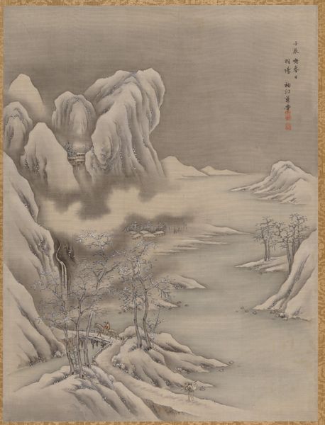 Seki Shūkō created "Visiting a Friend," a hanging scroll made with ink and color on silk. The painting invites you into a tranquil, misty landscape, dominated by soft grey mountains and subtle washes of ink. The composition pulls your eye upward, following the path of a lone figure towards a cluster of buildings nestled among trees. Consider how the artist uses the monochrome palette not as a limitation, but as a way to explore tonal variations and textures. This approach emphasizes the structural elements of the landscape. The brushstrokes create depth and atmosphere, while the blank spaces are just as important, suggesting the ephemeral nature of mist and distance. In classical Chinese painting, landscapes reflect philosophical ideas about humanity's place in the natural world, focusing on harmony and balance. The semiotics of the scholar or traveler visiting a friend often symbolizes seeking wisdom or enlightenment. Appreciate how Shūkō’s work uses traditional forms to explore a quieter, more personal vision of nature. The enduring appeal of this work lies in its capacity to evoke contemplation and a connection to the natural world.