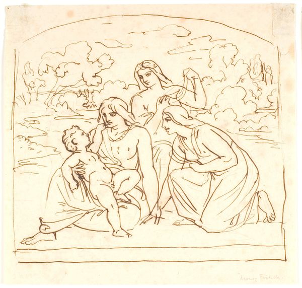 Editor: This delicate pencil drawing is titled "Three Women and a Child on a Roof," created by Adrian Ludwig Richter sometime between 1820 and 1884. It’s interesting to me that it depicts women seemingly in a domestic setting, but placed outdoors and at a great height. What strikes you about this piece? Curator: For me, the interest lies in considering the social context surrounding the labor suggested here. Look at the implements for spinning and weaving; this suggests that this image should be considered alongside textile production of the era. Richter captures a very specific type of labour and we should investigate what that tells us about societal power dynamics. Editor: So you’re suggesting that rather than focusing on the "artistic" quality of the drawing, we consider the work in terms of what the image represents about work in the domestic sphere and gendered labour roles in that time? Curator: Exactly. The choice of depicting women engaged in textile production, even in what seems like an elevated, idealized setting, forces us to acknowledge the often-unseen labor that underpinned much of society. Consider the material conditions that made this scene possible, both for the artist and the subjects he portrays. What kind of access did each have to materials, to leisure? Editor: That’s fascinating. I hadn’t considered the economic implications inherent in the scene itself. I was focusing on the mood and aesthetic of it, but it's crucial to think about who had the means to create art, who was depicted, and what their relationship was to labor. Curator: Precisely. Even the 'humble' pencil and paper are telling of class and consumption at this period. What we are doing is unpicking an ideological context through its material means. Editor: I’ll definitely look at art with a different perspective now. Thanks for expanding my view! Curator: My pleasure!