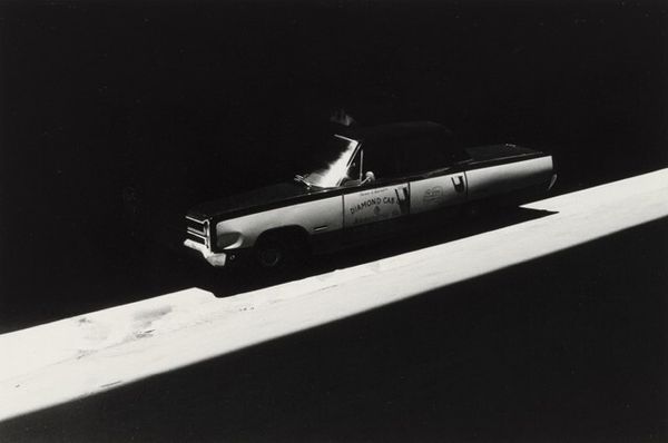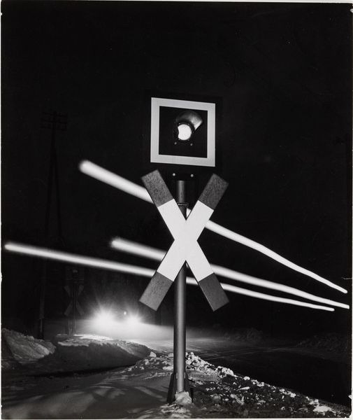 Curator: Edward Ruscha’s gelatin silver print, "Shell - Daggett, CA," really captures a specific slice of Americana. It's a bit ghostly, wouldn't you say? Editor: Absolutely. It's blurred, like a half-forgotten dream of a roadside stop. The Shell sign, a beacon in the darkness, feels almost… spectral. Curator: Well, that blur is key. Ruscha often focuses on these ubiquitous symbols, imbuing them with a sense of transience. The gas station becomes less about function and more about mood. Editor: It’s archetypal, isn't it? The journey, the pit stop. Shell becomes a symbol of transition, of constant movement, but also a place to refuel, physically and metaphorically. A liminal space, almost. Curator: I agree, plus there is that slight imperfection to it. It has some kind of deep artistic intention. It almost feels like an accidental painting. Editor: Yes, the imperfections give it a human touch. It's less about the Shell station itself, and more about what it represents. I find it incredibly evocative. Curator: It does linger in the mind, doesn't it? Something so mundane, elevated to the level of a haunting memory.