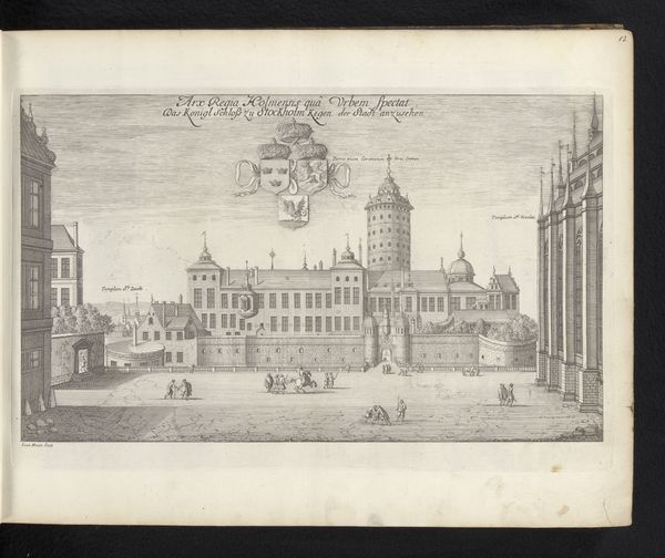 Editor: This is "View of Borgholm Castle from the East" by Willem Swidde, made in 1691. It’s an engraving, and the level of detail is amazing. The castle looks imposing, almost unapproachable. What’s striking to you about this piece? Curator: What interests me is how Swidde’s engraving functions as a form of political communication. Notice how the castle dominates the composition, symbolizing power and stability? Think about the role prints played in the 17th century. They were reproducible, relatively inexpensive, and circulated widely. Editor: So, it’s more than just a pretty picture of a castle? Curator: Exactly. It’s a visual statement. The placement of the coat of arms above the castle further reinforces that connection to authority. Who do you think was the target audience for this print? Editor: Maybe wealthy landowners or nobles, people who would appreciate the image of power? Curator: Possibly, but consider the broader Dutch Republic at the time. There was a rising merchant class with increasing political influence. An image like this could also serve to legitimize authority in their eyes, reminding them of the established order and the protection the castle provides. How does understanding its potential audience shift your perspective? Editor: I hadn’t thought about it that way, focusing instead on just the artistic merits. Seeing it as propaganda makes it much more intriguing. It makes you question what the artist wanted you to believe! Curator: Precisely. It reminds us that art always operates within a specific socio-political context. It serves not just as representation but also as an ideological apparatus. Editor: That's definitely something I'll remember moving forward, that art reflects its environment. Curator: And shapes it too, which I think makes it a rich resource for understanding the past!
