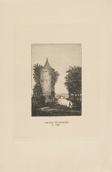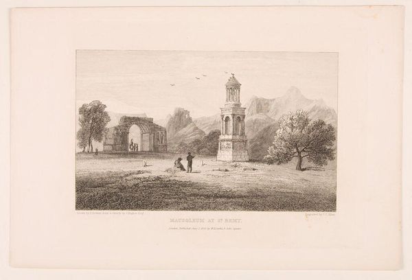 Curator: This etching, titled "Seintoren te Nijemirdum," made between 1822 and 1845 by an anonymous artist, offers a glimpse into the Netherlands of the early 19th century and is held at the Rijksmuseum. Editor: It has such a quiet feel to it. The neutral tones really emphasize the imposing architecture and the open landscape. You can sense the history embedded in that tower. Curator: The work is particularly compelling when you think about the history it documents. The stark monumentality of the tower becomes this symbol of power, permanence—but against the backdrop of daily life with people casually walking by. The history embedded in this rural scene becomes part of a larger social narrative about national identity. Editor: The materials are so crucial to understanding this piece as well. This anonymous printmaker carefully used etching and engraving to reproduce precise architectural details. Think about the skilled labor required to render those stones, those tiny human figures…The consumption of images like this also fed into a broader industry. Curator: And doesn't that consumption then reinforce specific ways of seeing landscape, culture, and ultimately, power structures within Dutch society at that time? Who benefits from promoting such views of permanence and stoicism? I always try to bring discussions about the context surrounding national identity into a contemporary view of diversity and multiculturalism. Editor: Absolutely, the materials and means of production aren’t neutral. But I also want to highlight the artistic labour to consider a wide array of approaches beyond high art. This historical scene comes to us through the hands of real artisans who worked with intaglio processes in potentially collaborative environments. Curator: Seeing the artisan and also acknowledging that these supposedly simple rural scenes, they carry complex cultural codes and promote particular ideological meanings, don't you agree? Editor: Undeniably, considering labor helps unveil those codes that speak to power dynamics and the historical context of art and image making in nineteenth century Europe. Curator: Examining images such as this pushes me to consider broader sociopolitical impact—connecting history and contemporary society to ask critical questions of our inherited cultural material. Editor: Indeed, through material consideration, we start unpacking the networks that these images sustain; we understand both artistic craft and consumer economies that built shared visions of place and nationhood.