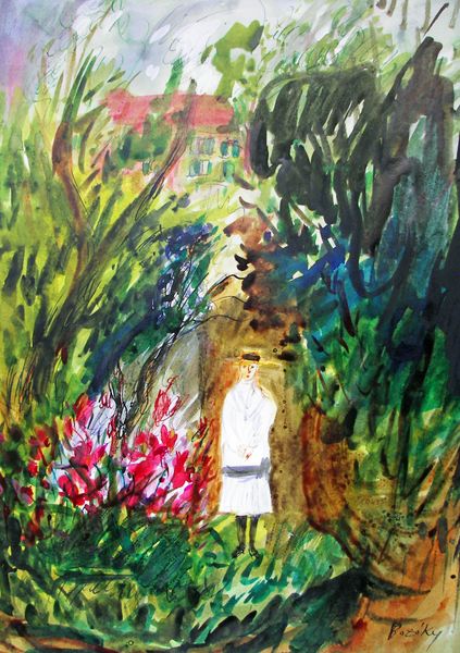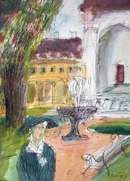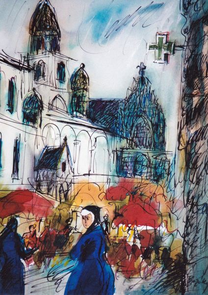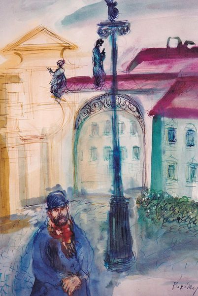 Curator: Let's turn our attention to Maria Bozoky’s “Market in Prague,” painted in 1994. The medium here is watercolor on paper. Editor: There's a remarkable immediacy. The sketchy quality of the watercolor gives it a feeling of being a snapshot, but at the same time the somewhat unnerving face looking out grabs all the attention. Curator: Absolutely. What is compelling is Bozoky's masterful, but at the same time seemingly rapid, use of the watercolor medium to depict this urban scene. Look at the drips, the way the building in the background is defined by a thin, wavering line—a calculated gesture of economy to focus attention on that central figure in the foreground. You can feel the work being made. The labor is right there on the surface. Editor: That directness reminds me of the visual language found in folk art. There is a sense that we're seeing not just a market scene but also something symbolic about Czech identity and resilience reflected in the everyday rituals. Markets are vital arteries in any city's identity. I'm interested in the bright blue on the building's windows, a symbol of serenity amid all the apparent commerce. Curator: Well, Prague as a cultural crossroads lends itself well to the symbolism you see here. The artist seems attuned to a vernacular language in building the cultural and economic narrative—but consider the global consumption of this painting and the irony. That central figure might represent resilience but, framed by western eyes, she can also become a product, can’t she? Editor: I see your point about consumption, but look closer at her face: that is the knowing gaze of someone participating in a complex economic dance. The way the vendor and buyer might represent ancient archetypes or modern power dynamics is a reflection of an intersection point in a long cultural chain, after all. Curator: So, whether we consider "Market in Prague" a document of process, or a site of layered visual echoes, Maria Bozoky is holding up a mirror to Prague as both a lived place and an idea that can travel globally via watercolors. Editor: Yes, it’s been wonderful exploring the dialogue in the work between labor and symbolism, haven't you found?
