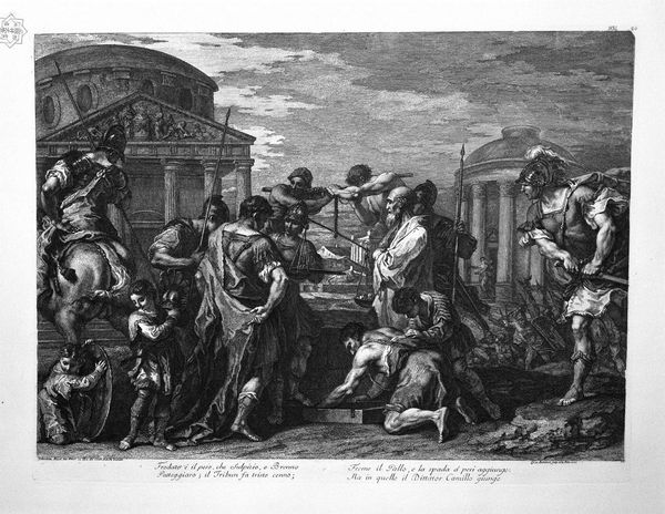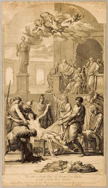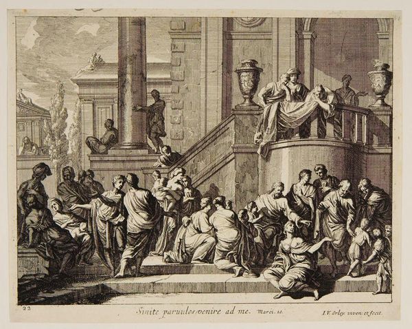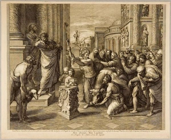 Editor: This is François de Poilly the Younger's print, Saint Cecilia Distributing Her Wealth to the Poor. It's a very busy scene, full of figures reaching, grabbing. What social commentary do you see in this depiction of charity? Curator: Well, prints like these, circulated widely, weren't just devotional. Consider the backdrop of economic inequality. The act of distributing wealth, framed by architectural grandeur, presents a nuanced power dynamic. Who benefits? Who controls the narrative? Editor: So, it's not just a straightforward act of kindness being represented? Curator: Exactly. Where is the agency of the poor in this picture? Is it truly empowering, or is it perpetuating a system of dependency? It's about interrogating those power structures, even within seemingly virtuous acts. Editor: I never thought about it that way, it's definitely something to consider. Curator: I think that looking at power dynamics helps us understand the social dimensions of these images.