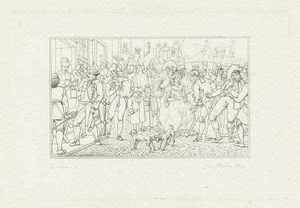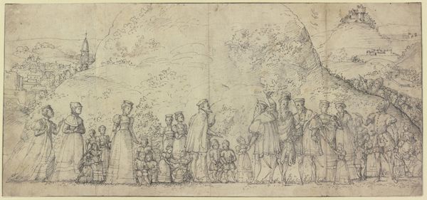 This illustration to Schiller's 'Song of the Bell' was made by Moritz Retzsch using pen and ink on paper. The choice of materials is quite traditional, yet the subject is of its time: the artist is illustrating a poem that emphasizes the value of labor. The fine lines of the ink create a delicate, almost lace-like quality, contrasting with the weightier themes of community and industry found in Schiller's poem. It's intriguing to consider how Retzsch uses a relatively simple and accessible medium to depict a complex social landscape, and how the very act of drawing, with its inherent demand for careful, skilled labor, mirrors the poem's celebration of craftsmanship. The image shows us a snapshot of society, complete with figures from different social strata. Retzsch’s illustration invites us to consider how artistic practices like drawing are intertwined with broader social and cultural values, challenging the idea that art exists in a realm separate from everyday life and labor.