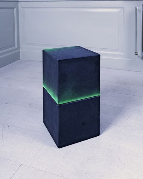 This 'Untitled' work by Guy Mees presents a luminescent rectangular pillar, glowing with a cool, ethereal blue, wrapped in delicate lace. Lace, throughout history, has been an intimate adornment, gracing garments and domestic spaces alike. It speaks of refinement and hidden intricacies, often associated with femininity and domesticity. Think of the lace ruffs of the Elizabethan era or the delicate veils of a bride. Now, consider how Mees transforms this familiar pattern into a monumental form. The geometric form grounds the ephemeral nature of light and lace. This echoes the pillars in ancient temples, where light, often filtered through colored glass, was used to evoke spiritual and emotional responses, aiming to bridge the gap between the earthly and the divine. Thus, this work is like a modern reliquary, encapsulating a shared memory and beckoning us to contemplate our emotional relationship with adornment and illumination.