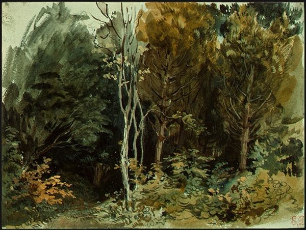 Curator: This watercolor by Eugène Delacroix, entitled *The Edge of a Wood at Nohant*, likely dates from around 1842-1843. My first impression is how somber yet delicate it appears. Editor: Somber is the word! There's a certain unease. Look how the watercolor bleeds and pools, especially on the left side; it evokes a sense of mystery, a kind of untouched wilderness perhaps. Curator: Exactly. Consider Delacroix's involvement with Romanticism, a movement obsessed with the sublime and the raw power of nature. It’s interesting, though, that he painted this *en plein air*, focusing his attention on a specific location to create the painting. We're far removed from his sweeping historical dramas, which were typically fabricated inside of the studio. What can be made of that? Editor: That raises an interesting question about the artist's broader role in depicting place and, subsequently, identity. Was there, for example, pressure for someone of his stature to create idyllic pastoral images that masked social unrest or the exploitative labour that was used to produce and extract the landscapes we often take for granted today? In his choice to paint a humble edge of the forest, a scene void of people, there is much left to be read into that choice. Curator: I wonder if "choice" is the operative word here. There has always been the argument that *plein air* lends a certain objectivity that mitigates that risk. It's hard to ignore what you see right in front of you! The greens are not manicured, and the trees have scraggly, crooked trunks. We cannot assume these images were wholly devoid of the socioeconomic contexts surrounding them, which shaped the very act of creation as it occurred on location in Nohant. It certainly asks questions about who this work might be speaking to and who it silences. Editor: I think so too. We can't ignore the institutional power structures inherent in how the work functions. What can it achieve for Delacroix? How does his aesthetic vision either benefit or dismantle oppressive forces at play within 19th century France? Curator: On reflection, focusing solely on artistic vision seems inadequate in grasping its complete relevance, considering its lasting presence and continued display here. Editor: Absolutely. Analyzing art through its complex relationships with history and contemporary struggles allows us to perceive and comprehend the depths and contours of images such as these.