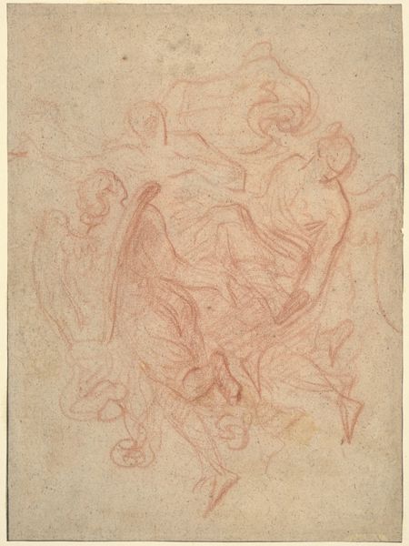Editor: So, here we have Carlo Maratti's "Virtue Crowned by Honor," a charcoal drawing from the 1670s, currently residing at the Met. It's a striking image. The figures are really dynamic. I can really get the sense of them moving upwards, being raised up to this grand space above. How do you interpret this work? Curator: Well, the allegory here speaks volumes about the cultural values of the Baroque period. See how Virtue is passively led upward? What does that suggest to you about individual agency versus divine will during that era? Editor: It definitely gives the impression of an external force being necessary. Virtue alone isn't enough. It's relying on something else to get crowned. But who exactly is crowning her? Curator: Look closely at the figure of Honor. Notice the active gesture, the placement above Virtue. What symbols are readily apparent? Consider who has agency within the work; how might that reflect societal values concerning reputation and status? What feelings does that elicit? Editor: So Honor, bearing the crown, seems to be actively bestowing it upon Virtue. And with Honor placed higher, there’s a definite hierarchy at play. But this raises questions – is it saying that you need recognition to truly *be* virtuous? Curator: Exactly. This image reveals a complex interplay. It suggests virtue, while intrinsically valuable, achieves its full significance, its coronation, through societal recognition and enduring reputation, symbolized by the crown of Honor. The symbolic weight shows the Baroque obsession with external validation, influencing behaviors in society through these sorts of symbolic structures. Does that reading change your first impression at all? Editor: It does. I initially saw upward movement, now I see this intricate system of rewards, revealing values about status of that period. Thank you! Curator: A keen observation. The artwork functions almost like a time capsule, revealing echoes of societal expectations still relevant today.