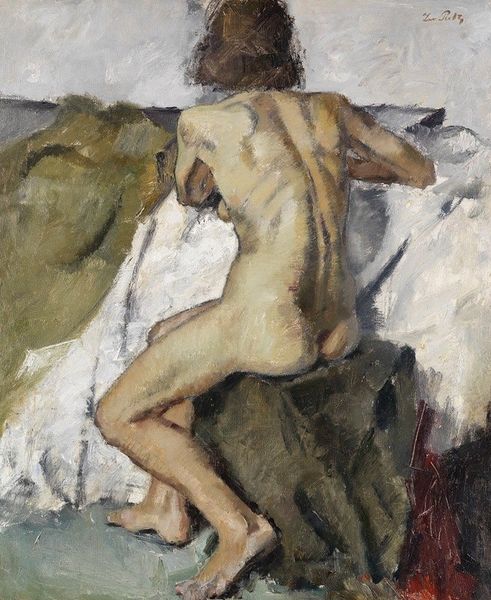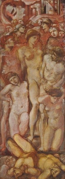 Curator: Standing before us is Pierre Bonnard's painting "Man and Woman," created in 1900. It’s a domestic scene, rendered in oil with notable impasto, now housed at the Musée d'Orsay. Editor: The immediate impression is quite dreamlike. A divided composition, a nude man and woman, an ambiguous doorway. It almost feels like a fractured memory, the colours are saturated but muted. Curator: It certainly plays on intimacy and the everyday, quintessential Bonnard. Note how he obscures a clear narrative, employing a stylistic rendering more rooted in romanticism, where the emotion takes precedence over realistic representation. There are many possible readings, what meanings might you associate with these figures? Editor: I notice the prominent division down the center. The vertical darkness bisects the composition almost creating two distinct canvases in dialogue. The textural density, the use of oil-paint and heavy impasto contribute to its very palpable and arresting tension. Semiotically the mirror suggests not vanity but instead is highlighting internal emotionality. The floral wall pattern almost makes this claustrophobic in it’s overt Romantic qualities. Curator: Absolutely. Mirrors are recurring motifs in Bonnard's work. But consider the historical context. The male nude traditionally symbolizes strength, dominance, even heroism. Bonnard subverts this, positioning him in this very private sphere, as more observer than participant, a reversal that mirrors the evolving role of men in society. Editor: That disruption is key to the lasting effect. By placing those symbols in opposition the message conveyed has more to offer us now, it invites interpretation rather than asserting a universal truth. There’s a strong commentary about subjectivity but presented in an intriguing painterly perspective. Curator: Bonnard seems more invested in suggestion than declaration. His use of implied meaning elevates this genre painting beyond a simple depiction of life in fin-de-siècle France, creating a lasting emotional echo that ripples throughout time. Editor: Ultimately, for me, it’s about the fragmented vision, it offers layers that unveil with each viewing. A fascinating exercise in perception and memory.