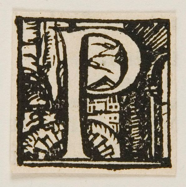 Curator: This woodcut, titled "Initial M" is by Ambrosius Holbein. Editor: Its immediate visual impact lies in its stark contrast and the dense, almost claustrophobic composition within the letterform itself. Curator: Indeed, these initial letters served a vital function. Consider the role of illuminated manuscripts in shaping knowledge dissemination before widespread printing. Editor: Focusing on the materiality, the heavy lines and the texture created by the woodcut technique give it a tactile quality despite its diminutive size. The eye is drawn to the interplay of positive and negative space. Curator: The letter itself, as a signifier, becomes a landscape, reflecting the cultural value placed on literacy and the power of the written word. Editor: Ultimately, it reveals the artist's mastery in condensing narrative and form within such a restricted structural framework. Curator: A powerful symbol, reduced to its most essential elements, and made accessible to all.
