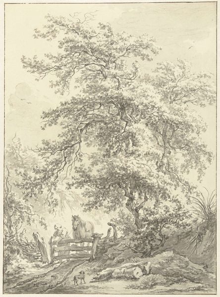 Editor: This is Charles André Malardot's "Landscape with Two Children Fishing" at the Harvard Art Museums. The meticulous detail in the trees creates a really serene atmosphere. What strikes you most about this scene? Curator: Ah, serenity! Yes. It’s more than just visual, isn't it? I feel a memory stirring, a whisper of childhood summers spent lost in nature. The landscape, so intricately rendered, feels like a sanctuary. What secrets do those trees hold, I wonder? Editor: That's a lovely thought. I hadn't considered the 'secrets' aspect. Curator: Maybe it’s just the artist inviting us to remember a simpler time? It certainly worked on me. Editor: I think it worked on me too, thank you.