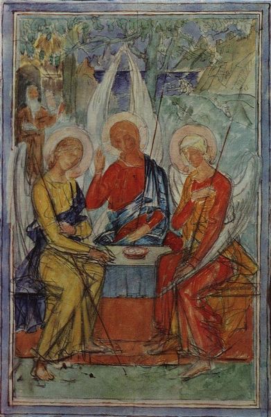 Curator: Looking at "Abgar of Edessa Receiving the Mandylion from Thaddeus," a Byzantine-era panel residing at Saint Catherine's Monastery, I am struck by the material choices – the use of tempera creates a matte surface that almost denies its own objecthood. What's your initial take? Editor: Immediately, I’m drawn to the weight of history and power embedded in this image. It speaks volumes about cultural exchange, religious devotion, and imperial influence through both figuration and historical context. The image, ostensibly a depiction of miraculous healing and conversion, is really about legitimizing political power and solidifying social control in the service of Empire. Curator: Absolutely. Consider that this piece from 944 isn't merely narrative; it’s a physical object of devotion produced within a specific workshop context. The careful layering of tempera, perhaps incorporating costly pigments derived from afar, indicates specialized artisanal labor—linking it directly to modes of production within a Byzantine economy. Editor: And to expand on that economic dimension, reflect on how the act of presenting the Mandylion becomes a transaction—not just of faith, but of influence and authority. The panel depicts Thaddeus bestowing not only a religious icon, but also validation upon King Abgar. The painting style reinforces a visual language aimed to convince viewers to give their tacit, even material, support to the political and religious ideology it reflects. Curator: But can’t we appreciate the icon itself? The materiality affects the spiritual experience, where each application of pigment to the prepared panel contributes to a potent devotional image. Editor: We must also consider whose spirituality it privileges, though. What about the labor required to create this kind of visual propaganda? And what other cultural narratives and spiritual expressions were marginalized or even destroyed in the process of establishing the prominence of images like these? Whose stories aren’t being told here? Curator: It's fascinating to consider those perspectives, acknowledging both the craftsmanship embedded within it and the systems that enabled its production. Editor: It pushes us to consider the ways power operates through both grand narratives and material objects. A powerful reminder to question who gets to shape history—and how.