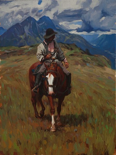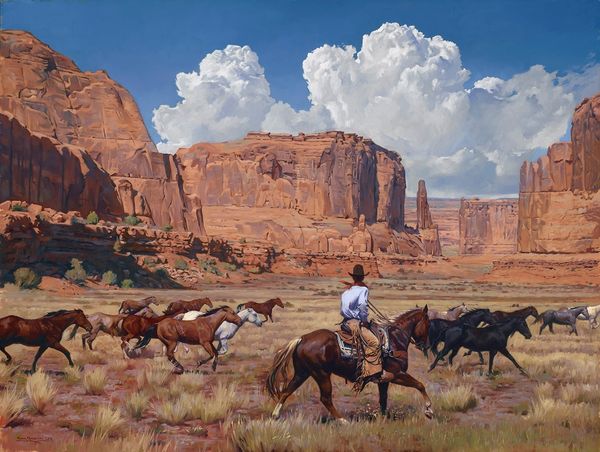Editor: Here we have Mark Maggiori's 2018 oil painting, "Ghost Ranch Rider." I'm immediately drawn to the contrast between the stark blue sky and the soft, almost dreamlike quality of the desert landscape. What story do you think the painting is trying to tell? Curator: It's interesting you say "story." I think Maggiori is consciously engaging with the *idea* of the West, and especially its visual representation as perpetuated through film and popular culture. Think about how many Westerns were filmed at Ghost Ranch! To me, this isn't necessarily about authentic experience, but about a performance of "Western-ness" within a very specific cultural context. Editor: So, you're saying it’s almost a commentary on the romanticized image of the cowboy, rather than a true depiction? Curator: Precisely. Consider how the painting utilizes classical techniques to create a familiar and easily digestible image. Oil paint, the landscape genre—it all speaks to a carefully constructed visual language intended to evoke very particular feelings about the American West. The rider himself, almost silhouetted, becomes an emblem. Editor: That makes a lot of sense. I was focusing on the individual cowboy, but now I see it as a broader statement. What would you say is the most important aspect in understanding its public role? Curator: I'd focus on its contemporary creation. Ask yourself, what does this image of the West, produced in 2018, offer viewers now? What desires or anxieties is it tapping into? This, to me, is where the real historical meaning resides. Editor: So it’s less about the historical cowboy and more about what the image of the cowboy means today. Thank you, I have a much clearer perspective now. Curator: My pleasure! I think it's a fascinating piece, prompting questions about how the West continues to be mythologized and commodified.