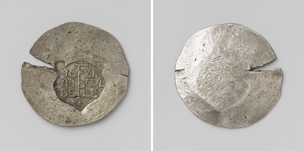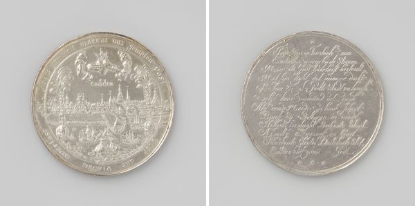 This silver medal, commemorating the recapture of Namur by William III, presents a fascinating study in miniature relief. Jan Luder, who created this piece, uses the circular form to frame two distinct scenes, each a tableau of symbolic and political significance. On one side, we see a dynamic depiction of conquest: figures in action against a detailed cityscape. The other side features more static, allegorical imagery. The composition here utilizes balance. Figures are placed symmetrically around a central structure. Text acts as a grounding element, anchoring the visual field. The very materiality of the silver lends a weighty, enduring quality, reflecting the historical importance of the event it commemorates. Luder's choices in composition and relief depth serve to underscore the themes of power, justice, and historical narrative, inviting viewers to decode the visual language of 17th-century political symbolism.