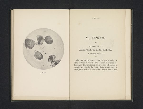 Curator: Here we have an intriguing image. It's titled “Microscopische weergave van artemisia pauciflora Weber," which translates to microscopic depiction of artemisia pauciflora Weber. Created by Léon Herlant before 1896, it combines drawing and print on paper. It gives us an interesting glimpse into the unseen world of botany. What are your first thoughts? Editor: My first impression is that it's beautifully eerie. Like peering into another dimension, but made of organic matter. The stark contrast within the circle is compelling, like tiny shadows dancing. I wonder what secrets this little world holds. Curator: The sphere emphasizes its otherworldliness, it’s a bit like a portal, a visual symbol of contained knowledge, an almost alchemical symbol. Herlant allows us to study what otherwise escapes our normal senses, expanding reality with visual observation. Editor: Exactly! It carries all the weight of hidden truths. How clever to bring our sight where our vision cannot take us unaided! It feels scientific, obviously, but it also borders on the mystical, an almost sacred understanding of the universe through something so tiny. It reminds me of those ancient symbols which hold hidden secrets of the world for those able to decipher it. Curator: Herlant seems interested in the symbolic language of scientific discovery. Note also, the plate numbering at the top left, that is common among scientific studies—to build a collection of knowledge, presented within an ordered whole. I’d wager that at the time it provided something revolutionary that would have offered tangible knowledge about something typically invisible to the common eye. Editor: Fascinating! And thinking of how this "realism" can, in fact, unlock such depths in both scientific thinking and self-reflection... What could these minute forms signify on a grander scale? Curator: Ultimately, I see a challenge in this picture – a silent invitation to see the profound beauty that resides at scales both infinitely small and immeasurably large, but also to realize the scientific mindset requires precision and humility, in order to accept our findings and move forward, step by step. Editor: I concur; this microcosm offers insight into ourselves and reminds us to look deeper and perhaps with just a touch more curiosity. Thank you!