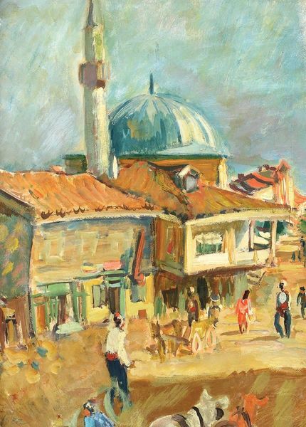 Editor: Here we have Denman Waldo Ross's "Tunis Street Scene," a small oil painting evoking a bustling marketplace. The layering of paint is quite visible. What strikes you about the materiality and process of this piece? Curator: The visible brushstrokes and the textured surface are essential. This isn't just a depiction of Tunis; it's about the labor involved in its making. Ross likely chose oil for its ability to capture light and texture, reflecting a Western gaze on a foreign landscape through the lens of artistic production. How does this interplay of labor and exoticism resonate with you? Editor: It’s interesting to consider the act of painting as a form of labor, especially when representing a culture outside the artist's own. Thank you. Curator: And consider the materials themselves – the sourcing of pigments, the preparation of the canvas. These processes connect the artwork to a network of trade and consumption.