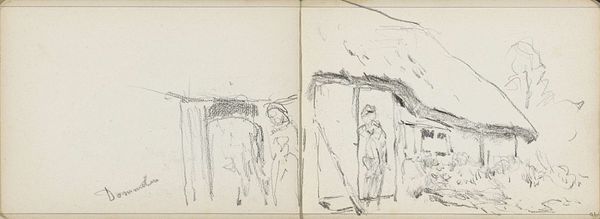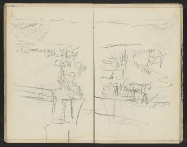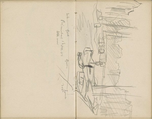 Curator: Willem Cornelis Rip’s sketch, “Zeilboten op het water te Gorinchem,” offers a glimpse into early 20th-century Dutch life. Created between 1905 and 1909 using pencil, it seems more than a record—it’s almost a feeling. Editor: Yes, a fleeting one at that. The initial impression is light and airy; the composition, sketched across what appears to be a double page from a notebook, is economical, built from what feels like pure essence. Curator: Indeed. The looseness invites questions of representation. Gorinchem, a strategically important city, occupied an interesting space within Dutch politics. We might even consider how artistic representations of waterways were tied to economic and colonial power at the time. Editor: From a formal point of view, observe the quick, light pencil work. It seems to capture the boats and surrounding landscape in a way that focuses almost entirely on light and shadow. The structure of the lines suggests an artist deeply engrossed with impressionistic principles. Curator: The lack of refinement and clear social cues suggests the landscape, boats and even figures within are more accessible elements for Rip’s artistry. It reminds me of other artists whose practice moved in step with broader shifts toward capturing the ‘everyday’ subject, such as a working river scene. Editor: Yes, consider the interplay of horizontal lines representing the water with the vertical thrusts of the sailboat masts. This generates a subtle tension, a visual rhythm that keeps the eye engaged despite its simplicity. It embodies the inherent drama within natural forms. Curator: A pertinent observation! Considering it’s part of a sketchbook, one can also imagine what other subjects occupied his mind. These were also pivotal times for European national identity and global conflicts. This work subtly opens doors for wider cultural explorations, don’t you think? Editor: Without question. On that note, one might contemplate how those strokes of the pencil evoke something enduring and permanent. Curator: An inspiring thought!